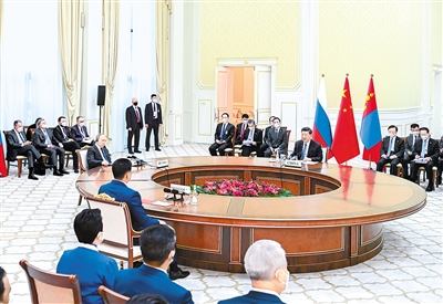 普京表示,俄中蒙三方合作成效显著,具有明显互利性质,为彼此关系发展增加了附加值。三国作为近邻,应该相互理解、相互支持,全面巩固推进三方合作。应鼓励支持三国企业家加强交流合作,推动交通、物流、跨境运输、能源、高新技术、旅游、人文等领域合作取得更多实质进展。