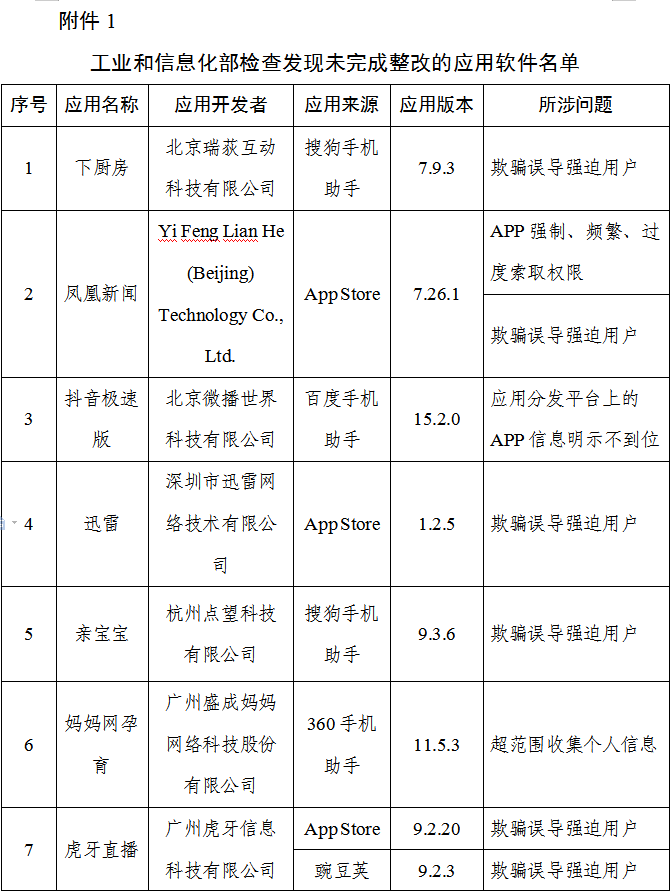 7月19日,工信部通报2021年第6批侵害用户权益App。截至目前,尚有145款App未完成整改,包括抖音极速版、虎牙直播、迅雷、蜻蜓FM等。上述App应在7月26日前完成整改,逾期不整改的,将依法依规组织开展相关处置工作。