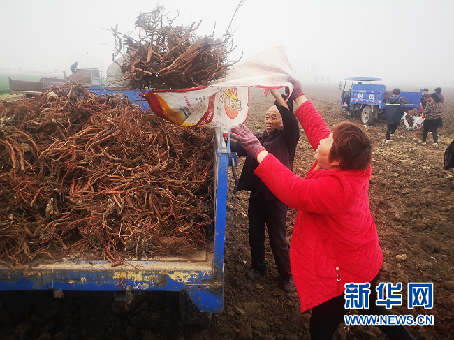 临泉县宋集镇农民在地里采收丹参。新华网 王雷 摄