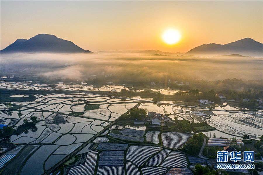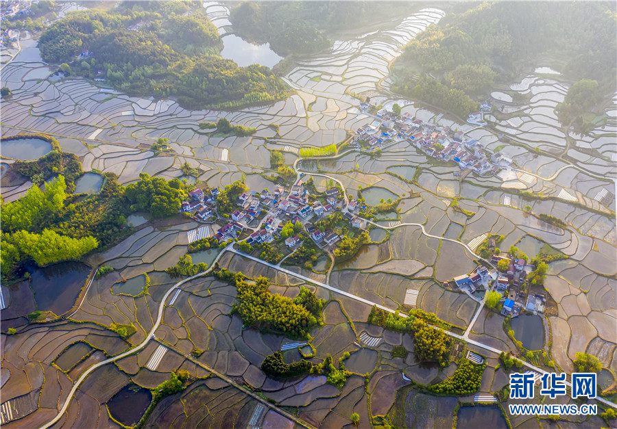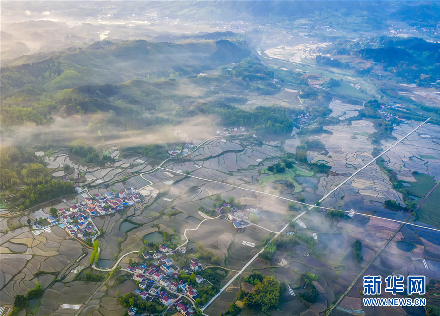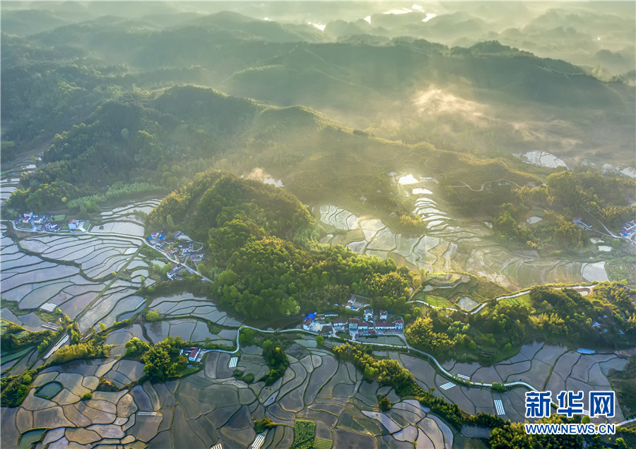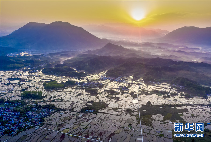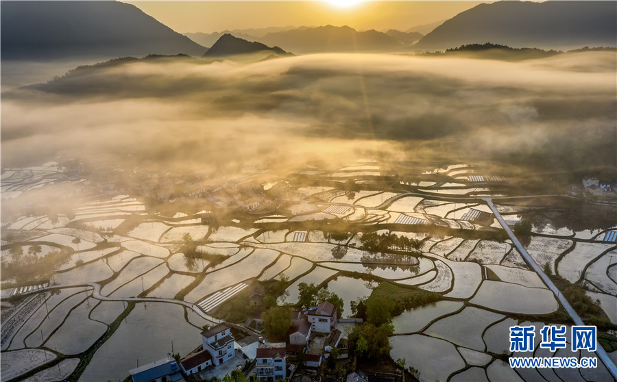 谷雨过后,安徽省旌德县兴隆乡三山村万亩梯田正适灌水插秧时节,美好山村春风荡漾,层层水田平波如镜,在晨雾笼罩中美若画卷。新华网发(孟伟 摄)
