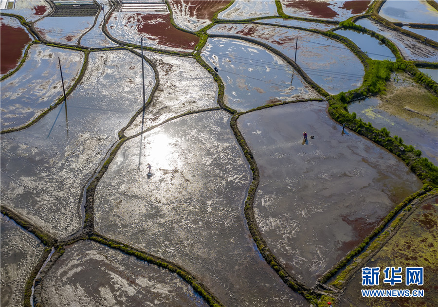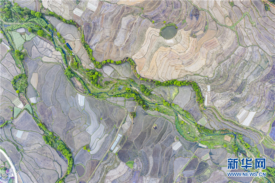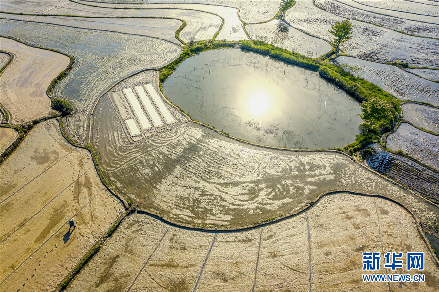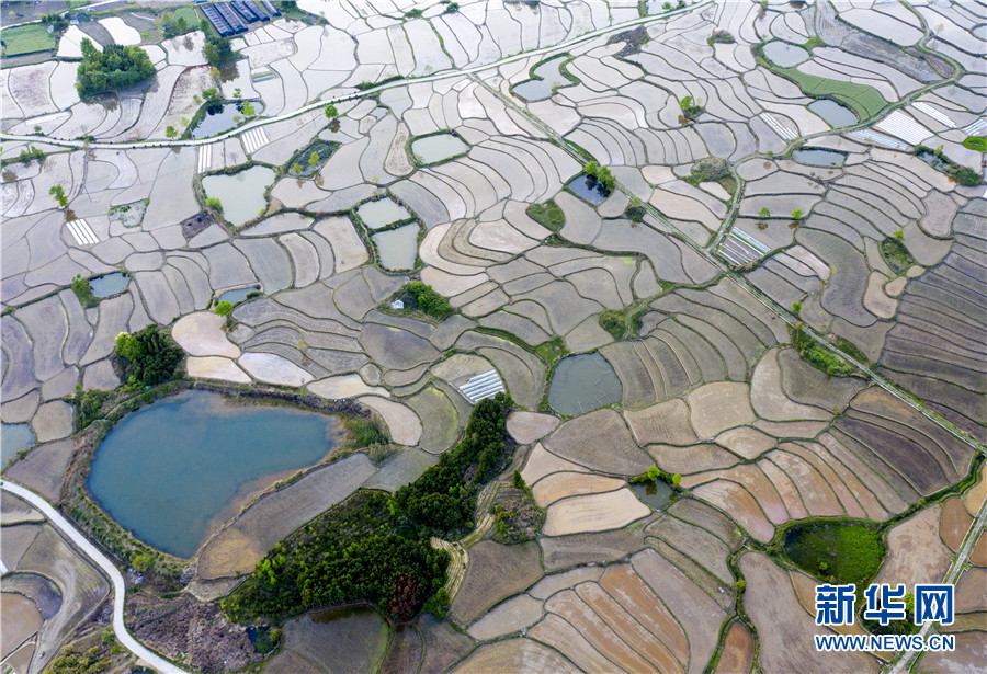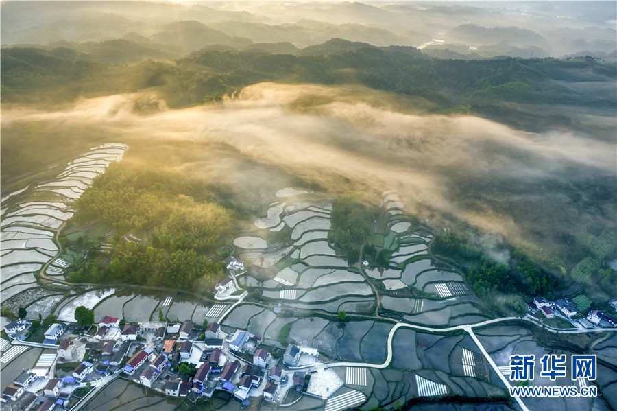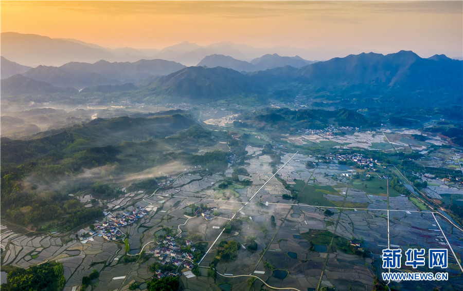 谷雨过后,安徽省旌德县兴隆乡三山村万亩梯田正适灌水插秧时节,美好山村春风荡漾,层层水田平波如镜,在晨雾笼罩中美若画卷。新华网发(孟伟 摄)