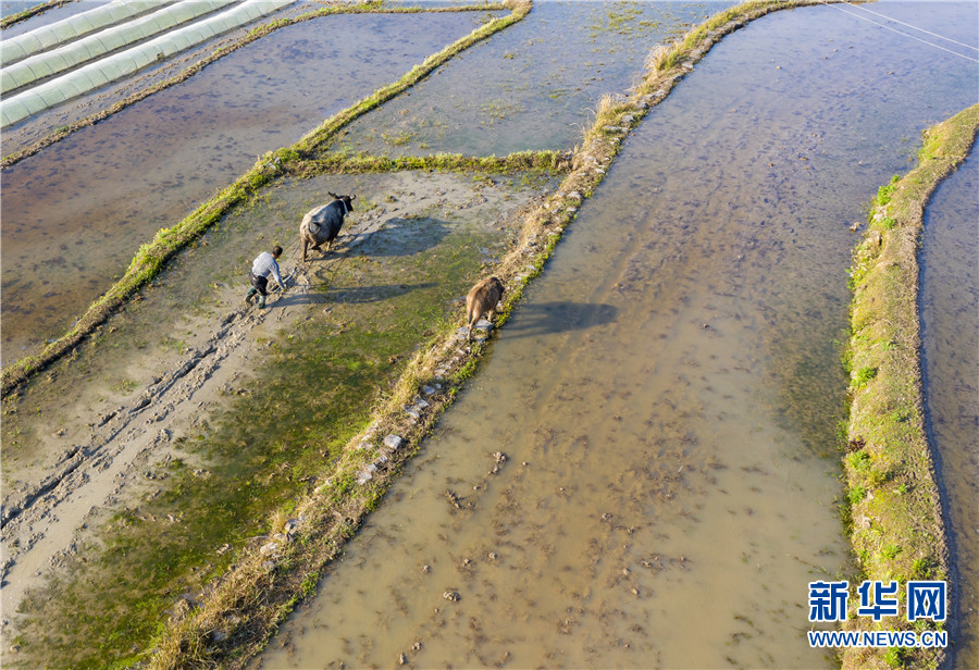 4月24日清晨,安徽省旌德县兴隆乡三山村,农民正在春耕梯田。