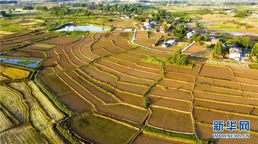5月18日,安徽省肥东县牌坊乡许井社区7000亩错落有致的农田,与民居构成了一幅美丽和谐的乡村画卷。