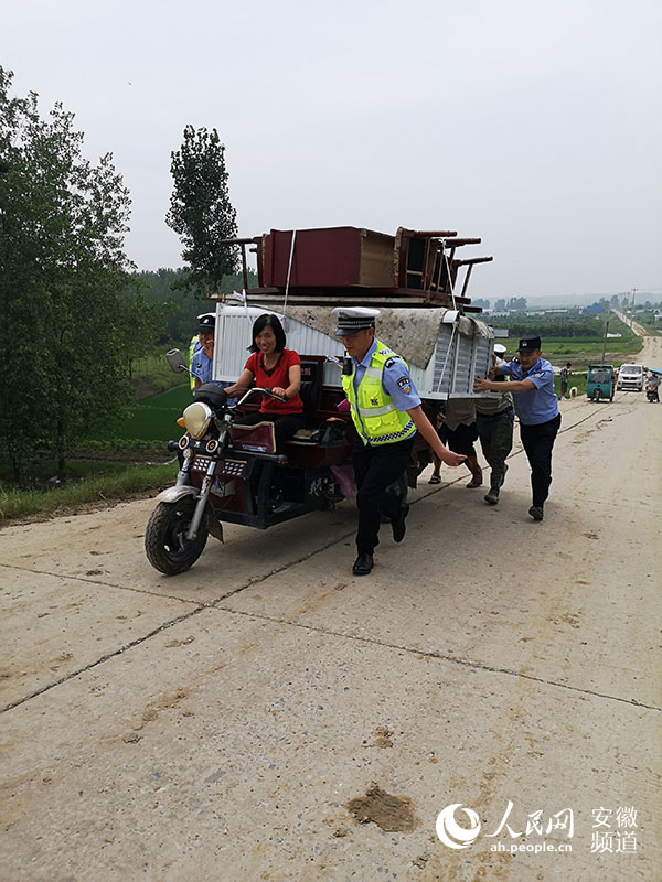 7月20日上午,颍上县公安局民警在邱家湖蓄洪区帮助群众转移生活用品 郑兰鹏摄