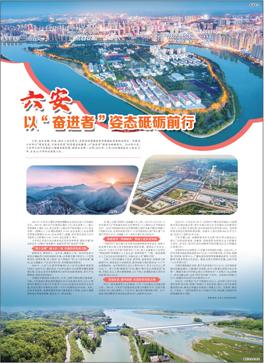 六安,地处安徽、河南、湖北三省交界处,是曾经的鄂豫皖革命根据地重要组成部分。安徽省六安市以“慢进是退,不进更是退”的思想自我鞭策,以“奋进者”的姿态砥砺前行。2018年以来,六安市人均可支配收入增幅加速赶超,稳居全省第一方阵;2021年,六安GDP增速在长三角40个市、全省16个市均位居第二位。