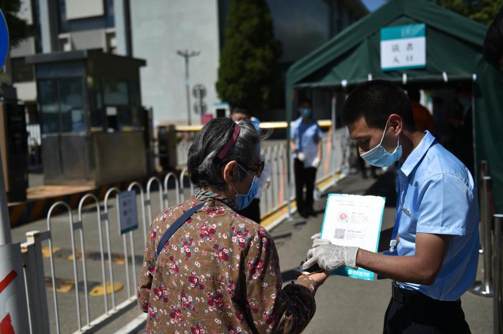 5月11日,在北京市海淀区的北京市十一学校龙樾实验中学,初三年级学生进入学校前扫描“健康码”。新华社记者 任超 摄