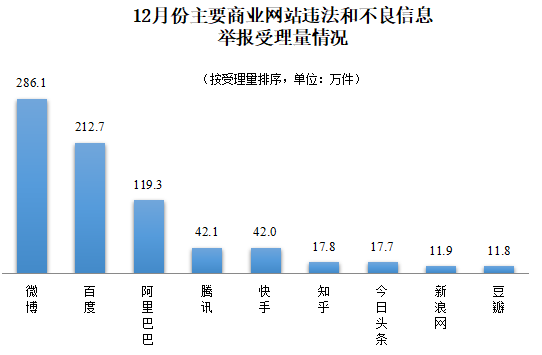 在全国主要网站受理的举报中,微博、百度、阿里巴巴、腾讯、快手、知乎、今日头条、新浪网、豆瓣等主要商业网站受理量占69.1%,达773.7万件。