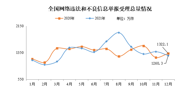 2021年12月,全国各级网络举报部门受理举报1260.3万件,环比下降8.4%、同比下降4.7%。其中,中央网信办(国家互联网信息办公室)违法和不良信息举报中心受理举报31.7万件,环比增长1.2%、同比增长87.9%;各地网信办举报部门受理举报108.9万件,环比增长3.9%、同比下降14.6%;全国主要网站受理举报1119.8万件,环比下降9.6%、同比下降4.9%。