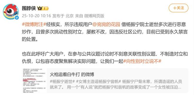 10月20日,微博社区观察员官方账号@围脖侠 发布消息称:经核实,所示违规用户@宛宛的花园 借杨振宁院士逝世多次进行恶意炒作,且曾多次挑动性别对立,屡教不改,因违反社区公约,目前已受到永久禁言的处置。