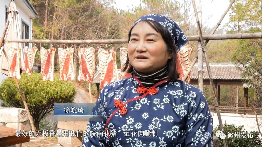 徐皖琦:最好的刀板香是用我们的皖南花猪,五花肉腌制,腌制的时候要用三次盐抹,抹好用石头压,压好放在水里清洗,洗好以后太阳里面晾晒,晾晒十几天,再把它放在阴的地方发酵十几天,大概一起要五十几天吧,这个刀板香就已经成功了,最好的刀板香的颜色就是奶白色和暗红色,烧起来放在刀板上切的时候,它那个香气会飘的,就是一个屋子都会香,所以简称刀板香,所以是我们徽州的一绝。