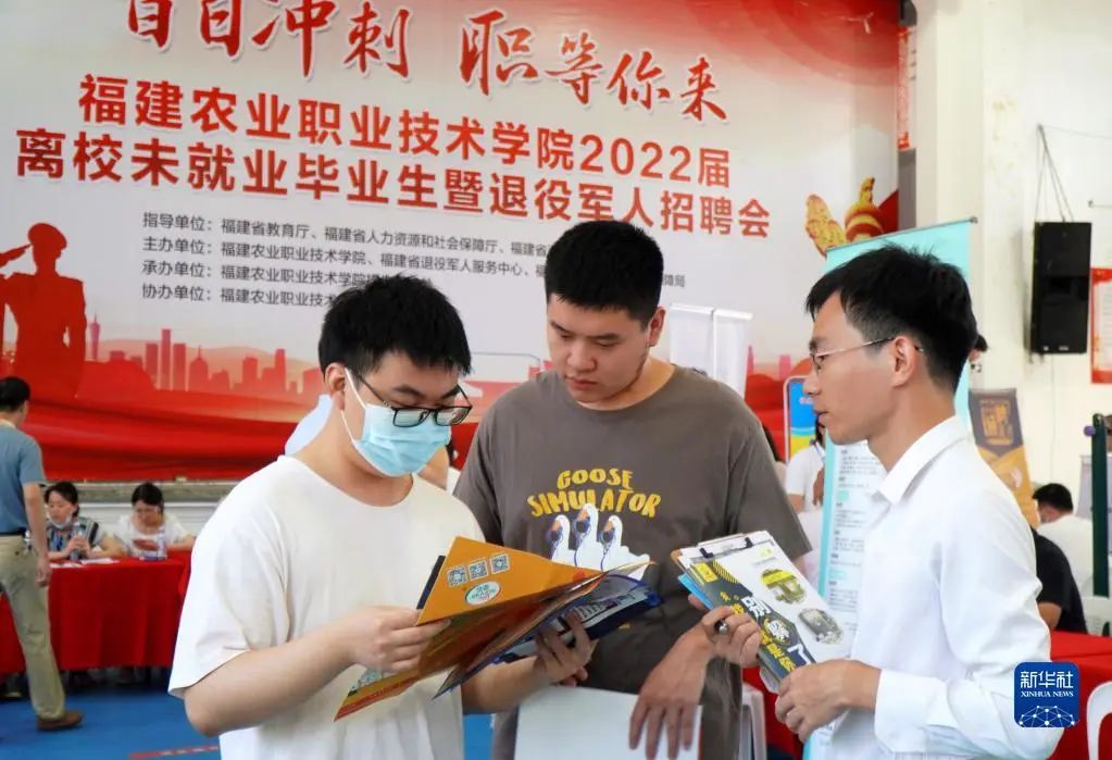在位于福建省福清市的福建农业职业技术学院,招聘单位工作人员(右)向两名求职者介绍工作岗位(2022年6月28日摄)。新华社发