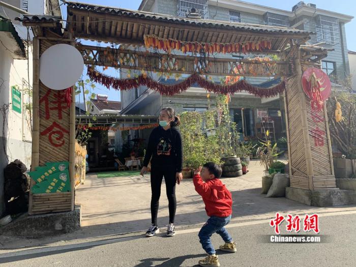 安徽霭里村,民宿老板赵文静在民宿门口。 中新网 彭婧如 摄