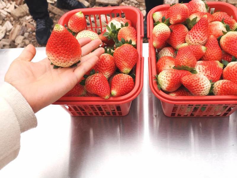 红粉相间的草莓半个拳头大小,拿在手里沉甸甸的,咬在嘴里甜滋滋的。刘少辉说:“这个品种草莓一年收4茬,亩产6000斤至8000斤,最高可达1万斤。现在1斤批发价25元至30元,比普通品种草莓贵三四元。”